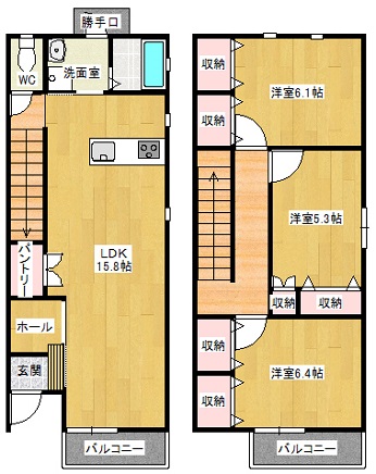 1階部分はリビングダイニング、2階に寝室と二部屋の洋室をご用意しています。
